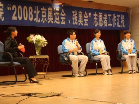 整场汇报高潮迭起,掌声不断,在一片其乐融融的气氛中有序的进行着。沈阳赛区的足球联络官吴明明同学代表沈阳赛区志愿者首先做了发言,难忘的志愿历程让所有观众为之感动、震撼;北京奥运会志愿者吴雨徽同学做了题为《巢起、巢落》的汇报演讲,话语间饱含着深情,眉宇间流露着真情,回忆间诉说着怀念。吴雨徽同学说:志愿服务的经历让她们无时无刻不在感染着、感动着、感悟着。感染于观众们的观赛激情,感动于运动员们的竞赛道德,感悟于志愿者们的忘我精神。随后,沈阳赛区的足球联络官、负责赛事服务的志愿者以及北京赛区的奥运会、残奥会志愿者相继为我们做了工作汇报和现场交流。