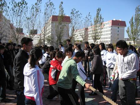 九月份,我们在新生军训之余举行了拔河比赛,比赛前,各班级负责人通过抽签决定了各班所在的组别和顺序。当天晚上,比赛进行的非常顺利,各个班的比赛队员努力着,坚持着,两侧拉拉队同学也在高声呐喊,为自己班的同学加油,为他们打气。当天决出了进入决赛的前八名。在比赛结束之后,也许是同学没尽兴,和我们06,07到场的同学进行了一场拔河友谊赛,将我们的比赛推向了高潮。
