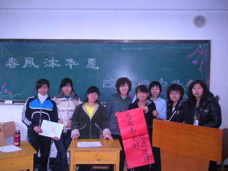 11月24日,在07级英语7班全体同学的共同努力下,我们成功举办了纪念改革开放三十年的主题团会活动,从活动形式的确定到活动内容的修改,从剧本的成型到演员的选定,每一个细微的环节我们都仔细考虑,认真推敲,最后排演出一次成功的主题团会。