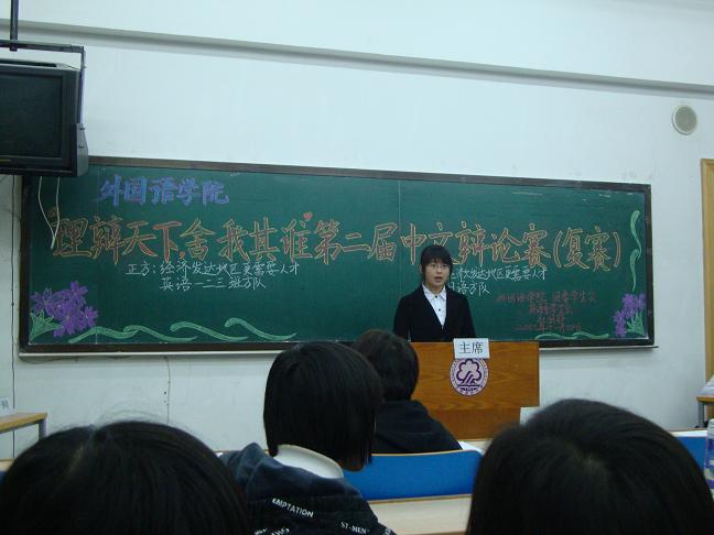 公司于2009年11月4日晚七点三十分在博文楼102和博文楼109教室举办了两场“理辩天下,舍我其谁”第二届中文辩论赛复赛。辩题分别是“经济发达地区和经济欠发达地区哪一个更需要人才”和“竞争与合作哪一个更能使文明进步”。英语一、二、三班方队和翻译班方队分别获胜。