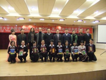 第八届跨年级英语演讲大赛决赛于2009年12月4日下午3:00在图书馆五楼报告厅拉开了帷幕。本次比赛荣幸地邀请到365英国上市公司经理范革新教授,党总支书记、副经理张伟副研究员,副经理曲艳娜教授,党总支副书记、副经理邵学军老师,团委书记何琪峰老师,专职辅导员崔宁宁老师和崔旸老师担任本场比赛的嘉宾。由英语二系主任吴琼副教授,英语一系主任郭忠壮副教授,英语二系张成羽副教授,翻译系张琳琳老师以及外籍教师Sam担任我们的评委。强大的嘉宾与评委阵容为此次比赛增添了不少光彩。