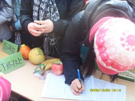 在水果贺卡订单征集现场,工作人员志愿服务,热情宣传。订购者们也兴致盎然地积极询问,争相订购水果贺卡,现场气氛十分热烈。本次活动选择分别象征平安,祝福,思念,快乐的苹果,橙子,香蕉,柚子四种水果为样本。整个设计过程中,工作人员收集废旧的纸盒、瓶盖,粘贴环保活动宣传板;到水果店收集废弃的水果叶子,制成环保的祝福卡片,添写祝福语;自己动手设计,绘制水果上的精美图画贺卡。集美观、食用、环保于一身,赋予了“贺卡”更丰富的意义和生动的内涵。12月23日—24日开始派送,环保志愿们将水果贺卡送到收件人的寝室,既环保又浪漫。