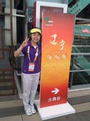 在辽宁志愿者开启世博服务之旅那一天,我原本在工作最轻松的7人咨询组,负责发放地图及咨询服务,但是因为辽宁馆的人手不够,便被调到到辽宁馆工作,负责辽宁馆场馆介绍与维持入场秩序。因为世博园内游客很多,秩序很乱,岗位距离远,我与队友只能练习用眼神交流。在辽宁志愿者中,我的年龄最小,但是,我并没有因此而经常请求别人帮助与照顾,反而负责了很重要的工作。我所在的组共有7个人,因工作需要,被分成两班,后因种种原因,临时抽调来一位男队友。在这个缺少男队员的组里,我自愿担负起男队员的工作。随着时间的推移,经过反复练习,每个志愿者都可以凭借眼神交流默契自如地与其他队友交流。我们手挽手,肩并肩,在入口处做好疏导工作。一天下来,由于没有耳麦,志愿者们的嗓子全部喊哑了,但是,我们只是背过身去偷偷地将一粒金嗓子喉宝塞进嘴里,转过身来,又是一脸阳光灿烂的微笑。面对游客们对我们提的各种问题,无论这个问题曾回答了多少次,我们都会不厌其烦地一边边讲解着;遇到不理解我们的做法的游客,我们也能不断向其解释我们的规定,并努力获得他们的谅解。