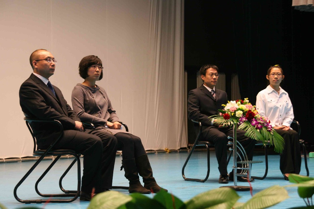 接下来,在观众的欢呼声中,剧组人员进行汇报演讲。郭旭东老师(饰虎子)主要介绍了英文版《原野》编排和赴美公演的过程,让大家深刻了解了剧组人员的辛苦与收获。他也谈及了美国之行的所见所闻,感受到美国观众对中国戏剧的憧憬与赞叹。王美芳老师(饰焦母)从两个方面讲述了本次参演的文化感受。一为戏剧之内:剧中通过运用巫蛊元素、莫扎特安魂曲、陶俑象征意义巧妙地将中西方文化相融合;二为戏剧之外:将文化教育融入课堂教学中。杨明老师(饰焦大星)则从教学方面详细阐述了本次公演的收获。语言的学习并不只局限于声音,更应通过表情、动作、举止,将情感交流赋予沟通之中,体现语言韵律之美,文化内涵之美。王晶晶同学(饰小黑子陶俑)表达了对公司领导、剧组成员以及曹禺老先生的感谢,并以亲身的体验给予10级学弟学妹一些学习上的建议——学习在于坚持,能力在于锻炼,激发了学弟学妹的学习热情。