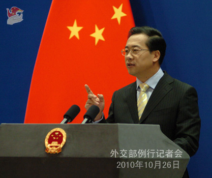 2010年10月26日,外交部发言人马朝旭主持例行记者会。