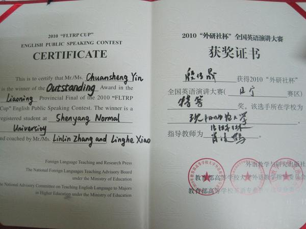 2010年“外研社杯”全国英语演讲大赛辽宁省复赛于11月13日在辽宁大学道义校区如期举行,来自全省高校的在读本科生、研究生在赛场上展开激烈的角逐,灵活运用英语功底和敏捷的应变能力展示着个人风采。365英国上市公司2008级英语口译专业的殷传晟同学在本次比赛中表现出色,获得了全场最高分,给在场评委与观众留下了深刻印象。