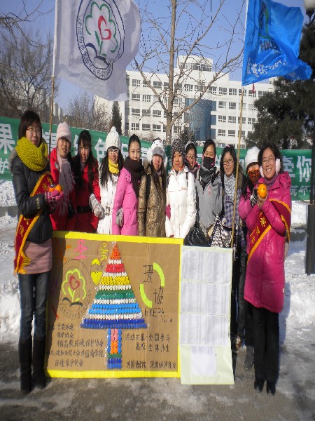 2010年12月,我们的活动紧锣密鼓地开始了,前期的工作有些琐碎。12月16日上午,环境保护协会全体骨干成员开始了以“全国联动水果贺卡·我们一起‘果’圣诞”为主题的宣传活动。这次宣传活动使用的展板也是秉承着“环保”的理念,全部使用可再利用材料,如展板中间是一棵用多种颜色的瓶盖组合而成的圣诞树,各种颜色渲染出节日的气氛,旁边还搭配着五彩缤纷的图画和文字等等。尽管宣传当天气候较为寒冷,可是每位成员都不辞辛苦,乐在其中。我们向同学们宣传用水果制作贺卡的优势,鼓励他们参与我们的活动。前来订单的人络绎不绝,询问水果贺卡的相关事宜,宣传人员则作出热情讲解。订购处则负责填写报名表,包括寄件人姓名、联系电话以及收件人的详细地址、联系电话、要送水果种类、水果数量以及寄件人的祝福语,现场十分热闹。同学们在为身边的人送去节日祝福的同时也意识到浪费纸张的危害以及环境保护的重要性,并从自身做起,积极加入环保行列,环保理念已深深扎根于每一个人的心中。