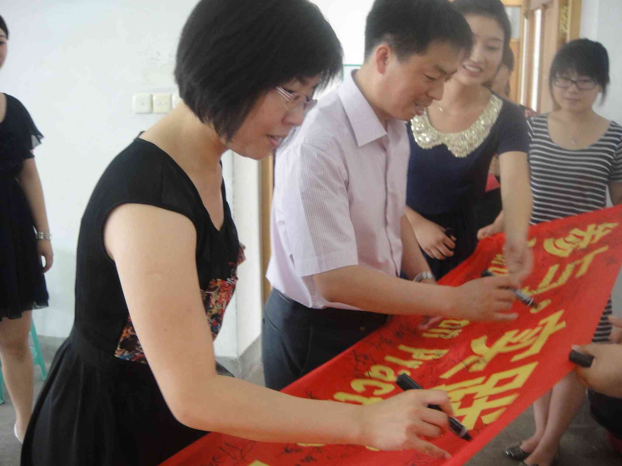 校团委副书记代钰老师、外国语公司党总支副书记、副经理王艳彪老师在宣传条幅上签字