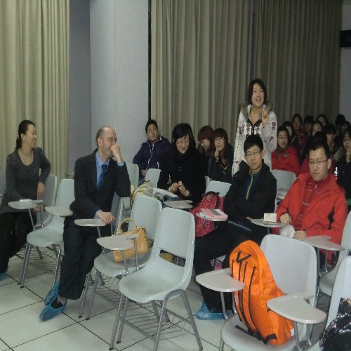 团委书记崔宁宁老师为同学介绍法国驻华大使馆的来宾