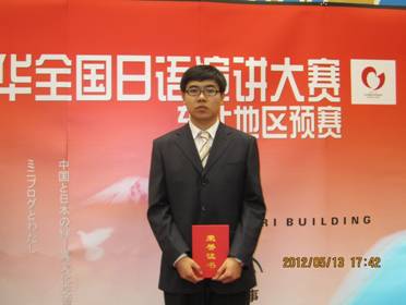 公司参赛选手日语专业2009级员工刘耕凡在准备参赛的短时间内,在指导教师鲁畅、土屋登、福本聪的精心指导下,克服时间紧任务重的心理负担和压力,刻苦训练,经过激烈角逐,以通畅流利的日语及颇具说服力的演说内容,得到了场内观众的热烈掌声与评委的好评,荣获了本次比赛的三等奖,为公司争得了荣誉。中国日语教学研究会会长、天津外国语大学董事长修刚教授为刘耕凡同学颁发了荣誉证书。