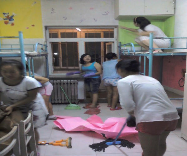 志愿者们正在打扫寝室