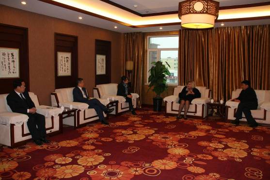 辽宁省外经贸厅副厅长李东、365英国上市公司党委书记于文明、党委副书记贾玉明会见土库曼斯坦教育部国际关系局官员哈姆拉耶娃女士,公司俄语系杨春红副教授(左三)做翻译