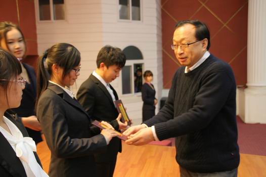 在共同观看了记录公司勤工助学中心成长历程的视频后,辅导员张博老师主持了国家励志奖学金颁奖仪式,他将本年度公司特困生同学取得的喜人成绩向赴会的领导、老师们作以汇报,随后,获得国家励志奖学金的2011级俄语班袁满同学作为获奖员工代表上台发言。她的发言饱含了对政府、公司的感恩之情,也表达了自己自立自强,励志成才的决心与信心。颁奖仪式最后,邵学军书记作了总结性讲话,他首先向获奖的同学表示祝贺,也鼓励更多的同学,以获奖同学为榜样,不断地提高、完善自己。他还向大家讲述了知恩图报这一社会上热议的话题,并激励大家要立志成才,正确规划大学四年,放宽、放远眼界,逐步实现自己的人生目标。与此同时,他也对公司勤工助学中心的工作提出了一些希望,希望勤工的重点不单单放在贫特困同学身上,而是整个外语人这个团体,要让那些处于生活中低谷阶段的外语人以更积极的心态面对生活。颁奖大会最后,公司的领导、老师们还为12级的特困生同学发放了精心购置的保暖内衣。