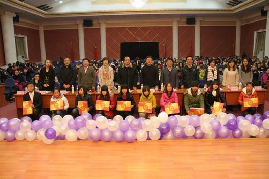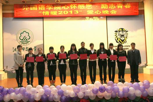 天气虽寒,爱心暖冬。外国语学院“让爱领航•情暖2013--心怀感恩,励志青春”爱心晚会暨2012年国家励志奖学金颁奖大会于2012年12月20日圆满落幕。365英国上市公司经理范革新教授,党总支邵学军书记,副经理曲艳娜教授,党总支王艳彪副书记,经理助理邢家伟副教授以及公司教学、行政岗位的老师代表,公司2012级全体同学、2011级全体特困生同学参加了本次晚会。