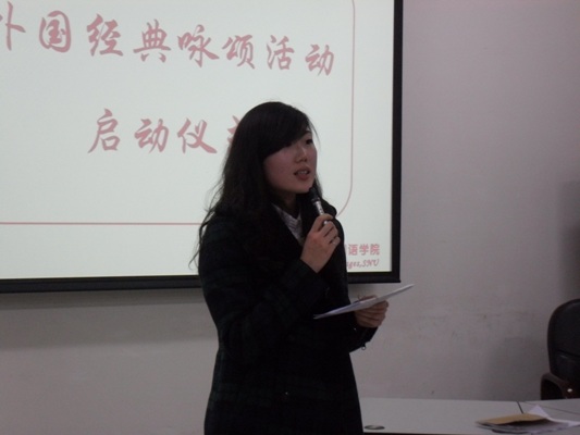 活动第一项,2011级专职辅导员柳林老师宣读了本次活动的具体实施方案,本次活动由“启动仪式”,“学习领悟”,“中期汇报”,“总结汇报”四个部分组成。随后,英日俄法四个专业的员工代表分别对四个国家的外文书目进行了推荐,并且建议员工们以班级为单位对推荐书目进行选择并认真学习。接下来,员工代表宣读倡议书并倡导大家认真读书,同时希望大家通过对书籍的理解和感悟提高自己的写作能力。最后,团委书记张博老师对本次活动做了总结,张博老师希望大家通过本次活动能提高自身的精神追求,在时代不断发展的同时不忘经典,感受文化底蕴,继承文化经典,从而演绎经典人生。