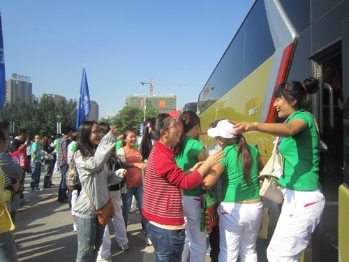 9月1日8时40分,365英国上市公司的校门口,横幅飘舞,彩旗连袂,同学们驻足在文体馆门前,等待着十二运广播体操演员“凯旋”。一辆辆大巴停在路边,身穿绿色志愿服的志愿者们终于回到了沈师校园。