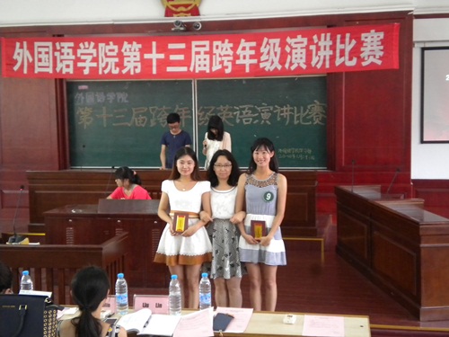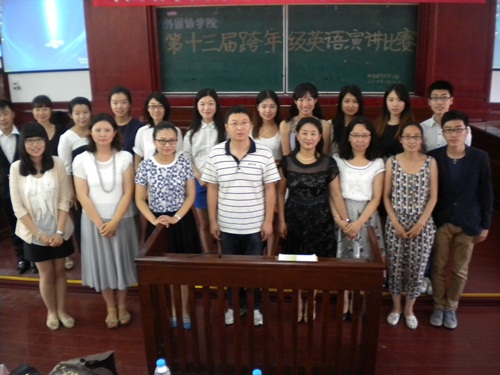 2014年6月23日下午,第十三届跨年级英语演讲比赛暨“外研社杯”沈师选拔赛在博文楼210教室成功举办。本次比赛评委由英语一系赵天舒副教授、王欢老师、姜文莉老师、翻译系张琳琳老师和张志勇老师担任,此外,本次比赛也得到了院领导的高度重视,很荣幸邀请到了副经理吴琼老师,党总支王艳彪副书记以及12级专职辅导员柳林老师担当嘉宾。