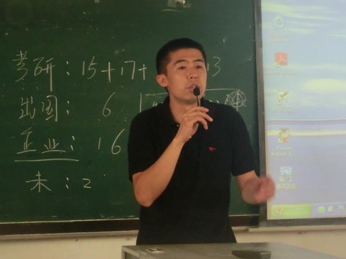 接下来,进入大会的主体部分,王艳彪老师主讲有关职业发展规划的内容。首先,王艳彪老师提出要做好自己的职业规划,并指出职业规划对于今后发展的重要意义。王老师鼓励大家考取研究生或者选择出国留学,以便拓宽眼界,李玉日后的发展、其次,王老师又为大家详细介绍了以后的职业就业方向和求职的基本途径,这对于这些准毕业生来说无疑是最大的帮助,毕竟只有明确了方向才有奋斗的动力。接下来,王老师还简单介绍了简历的制作,他强调,对于任何一位竞聘者来说,简历是强有力的敲门砖,给公司留下良好的印象是求职成功的第一要素。