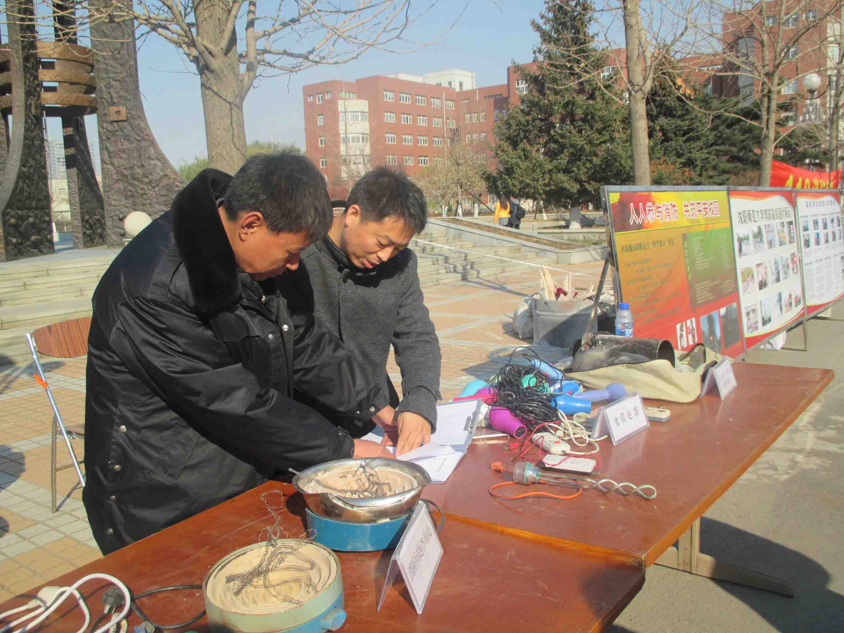 领导老师们在违规电器、劣质电器展示板前交流讨论