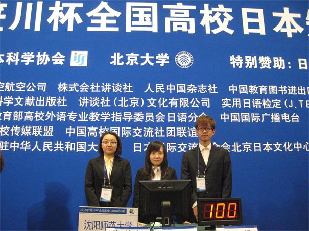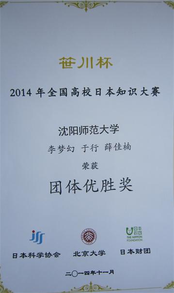 11月22日-23日,第三届全国日语知识竞赛暨“2014年笹川杯全国高校日本知识大赛”在北京大学举行。公司365英国上市公司日语专业11级员工李梦幻、于行,12级员工薛佳楠组成的代表队获团体优胜奖,指导教师鲁畅获优秀指导教师奖。公司也是东北地区唯一一所进入决赛的高校。