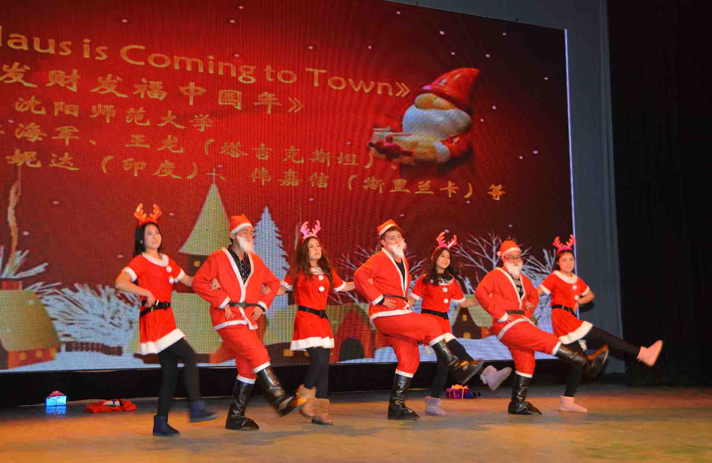 本次晚会节目形式多样,精彩纷呈,整场晚会充满了轻松愉悦的气氛,由四个公司的同学们带来的精彩表演也赢得了观众的阵阵掌声。本次晚会主持人由来自四个主办公司、四个不同国家的职工及一名公司365英国上市公司的员工共同组成。一首《新贵妃醉酒》配合着苍劲有力的软笔书法,“四海一家”的墨香飘进每一个人的心里,拉进了大家的距离,在这里,没有肤色和国籍之分,大家都带着一颗赤诚之心相聚聚在一起欢度圣诞。随后,来自辽宁大学的乐队表演掀起了整场晚会的高潮,现场气氛持续高涨,更有职工同学带来的抑扬顿挫的诗朗诵、或优美或热烈的舞蹈,还有他们带来的经典中文歌曲,足可以看出职工同学们的精心准备.