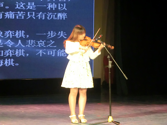 图为社团达人演奏小提琴。紧接着进行的是运动会、大艺展表彰,张博老师宣读了表彰决定。王艳彪副书记、ACCA机构领导分别为在校级比赛中表现突出并赢得荣誉的女子足球队、男子足球队颁奖;张帆老师、杨明老师、王威老师、童颖老师和罗洛老师为运动会先进方队、优秀负责人、优秀播音员优秀裁判员、优秀组织者颁奖;ACCA张立伟女士、王艳彪老师为获特殊贡献奖的同学以及辽宁省老员工艺术展演优秀表演团体颁奖。同时,张博老师也提出了自己的期望,希望大家能充分继承和发扬运动会的拼搏及合作精神,在以后的学习和生活中更上一层楼。