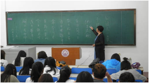 经典日语古语诗歌是本次大赛指定书写内容。比赛正式开始前,闫丽艳老师对诗歌内容进行了一定分析和讲解,使参赛同学对所写内容有了一定的熟悉感。在一段时间的自发练习之后,工作人员下发比赛用纸,比赛正式开始。在比赛过程中,选手们表现出了良好的书写习惯并书写出了自己的风格。在紧张而又轻松的氛围中,选手们作品陆续上交作品,比赛逐渐接近尾声。