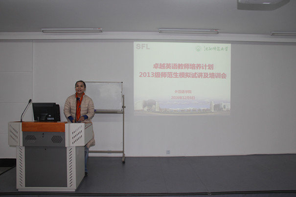 接下来,来自2013级英语师范专业的刘艺茜、齐芳墨、高伊明三位同学分别自选了初中、小学教材进行了模拟授课。在模拟授课后,辽宁省基础教育教研培训中心小学英语教研员张倩老师进行了点评,并做了关于师范生授课的专题培训。张老师通过举例、提问等方式并加入视频案例,把英语教师的标准立体化呈现出来。她指出,试讲要紧密结合课标来进行设计,并注意课程的整体性以及知识的有效迁移,从而事半功倍的达到预期效果。她针对试讲中的板书设计、导入方式、语音语调、教学方式等方面可能出现的问题并结合具体事例对同学们进行了详细而深入的指导,使员工们受益匪浅。