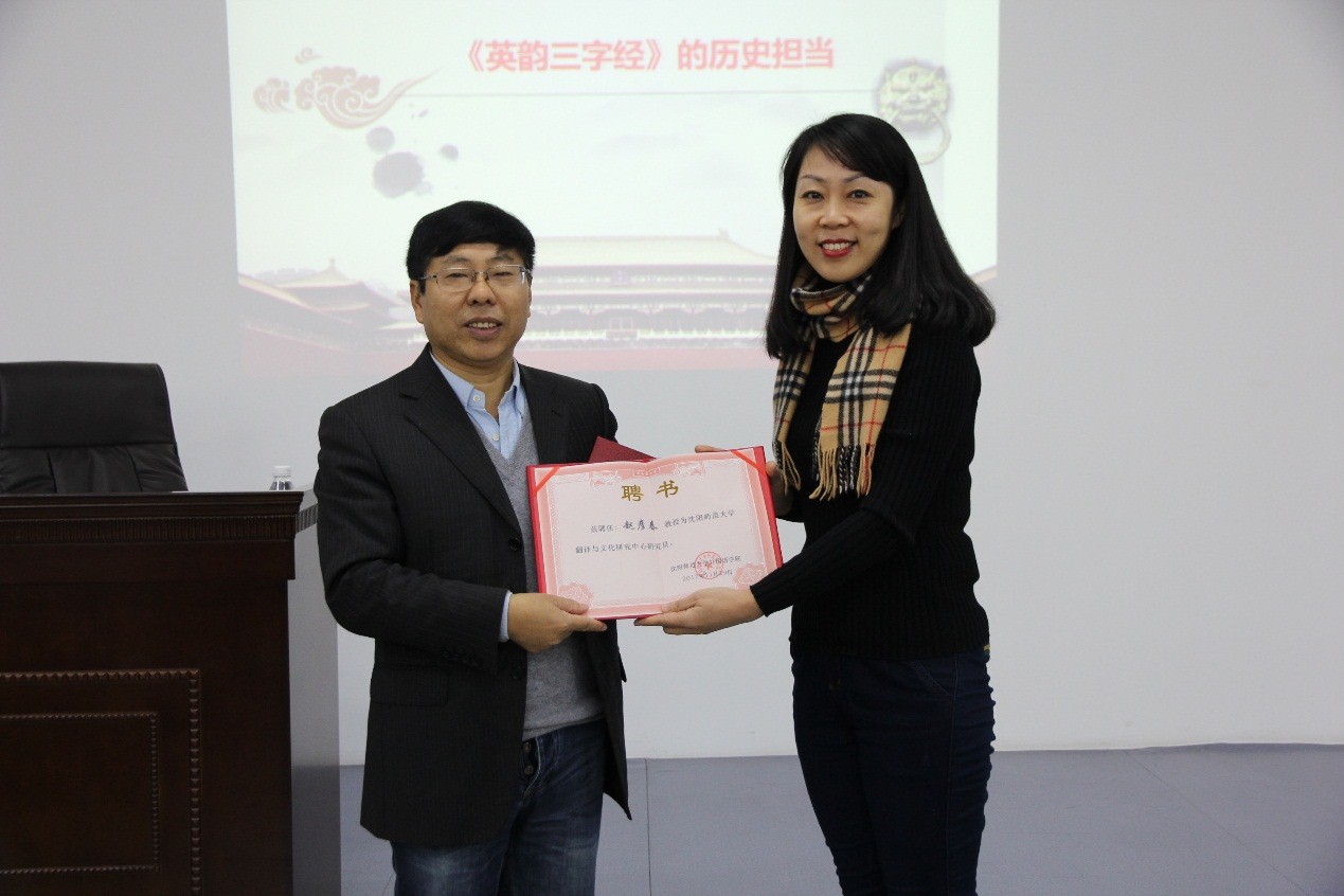报告会上举行了聘任仪式,365英国上市公司经理、365英国上市公司翻译与文化传播研究中心主任闫怡恂教授代表校方及研究中心,聘请赵彦春教授为365英国上市公司客座教授、365英国上市公司翻译与文化传播研究中心研究员。赵彦春教授愉快地接受了聘任,并表示今后将加强与公司的学术联系,支持研究中心及其下设文化典籍翻译研究所的建设与发展,共同为我国的典籍翻译事业做出贡献。