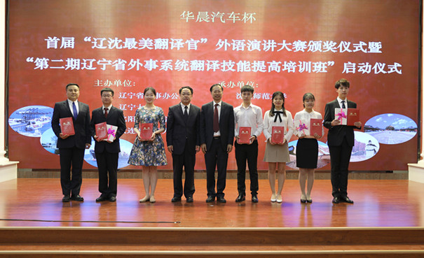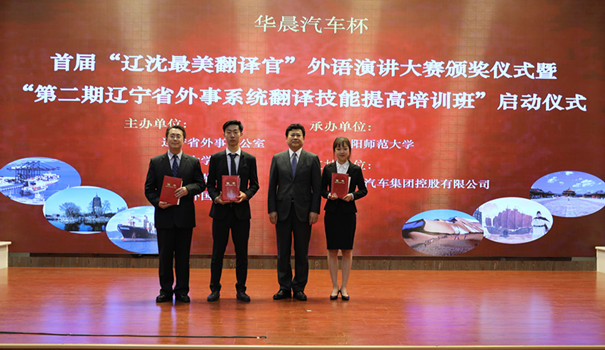 辽宁省外事办公室副主任赵冰冰、大连外国语大学副董事长丛明才、华晨汽车国贸公司市场部部长李哲为大赛二等奖选手颁奖