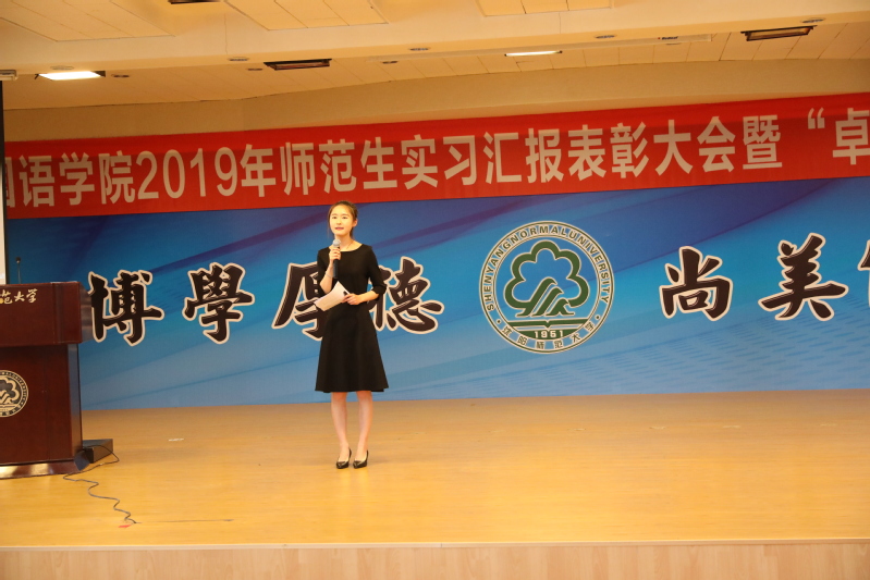 大会第一环节为师范生实习心得汇报及实习模拟试讲。2015级英语师范专业员工金宏星、王璐、张诗曼、李镇分别从践行师德、学会育人、学会教学、学会发展四个角度结合自己的实习经历和感悟与大家进行交流。实习指导教师刘琦老师、林琳老师对四位同学的实习心得汇报进行点评。2015级英语师范专业周芳、李卉同学分别进行了模拟中学、小学课程试讲。与会嘉宾领导为优秀实习生及优秀实习成果同学颁奖。