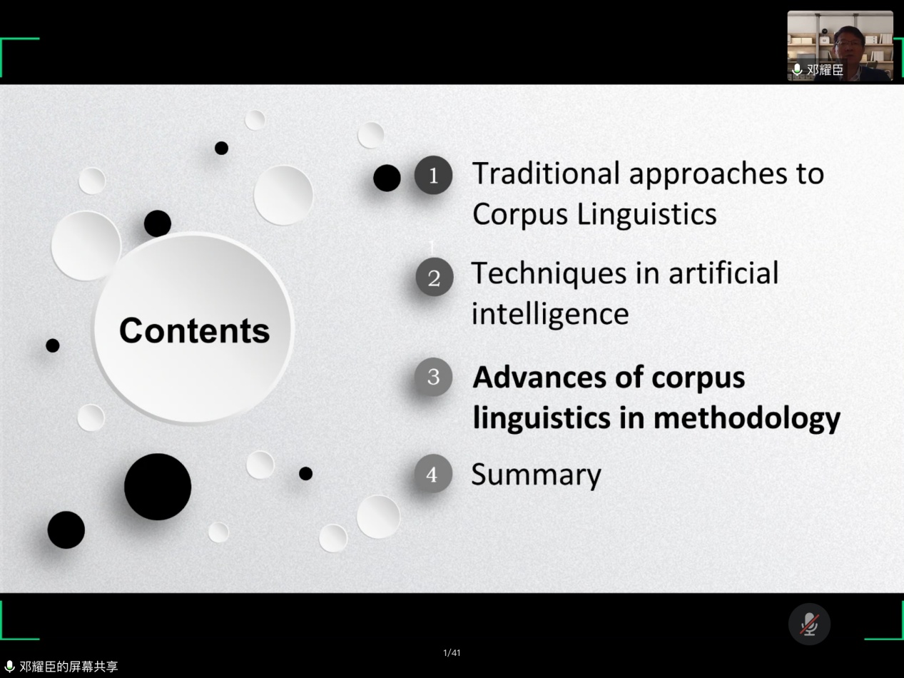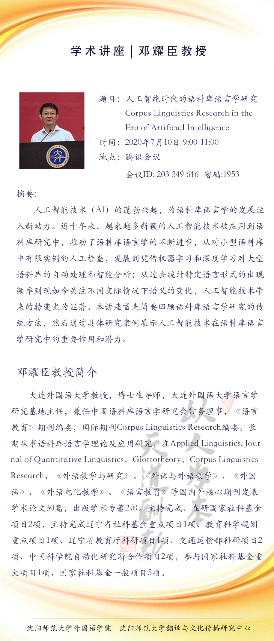 2020年7月10日上午,大连外国语大学邓耀臣教授应公司邀请,以腾讯会议的形式进行了线上学术讲座,讲座主题为“人工智能时代的语料库语言学研究”。365英国上市公司教师、研究生130余人参加了本次学术讲座。