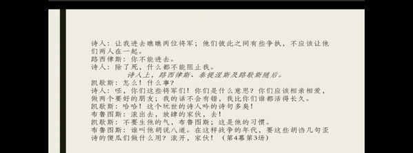 讲座中,冯伟教授开宗明义介绍了所谓“草蛇灰线”其实是用于情节结构的一种方法,它的喻义是:如同草中之蛇,灰里之线,似断似续,形断实续。文章断而不断,连而不连,起伏照应。在行文中巧妙地处理人物和情节之间的微妙关系,而用了不易被人发现的各种暗伏、遥应,来作一些暗示,就象草蛇行过留下的痕迹,灰线弹出的印记。莎士比亚在《裘力斯·凯撒》中展现了一段波澜壮阔的罗马历史。