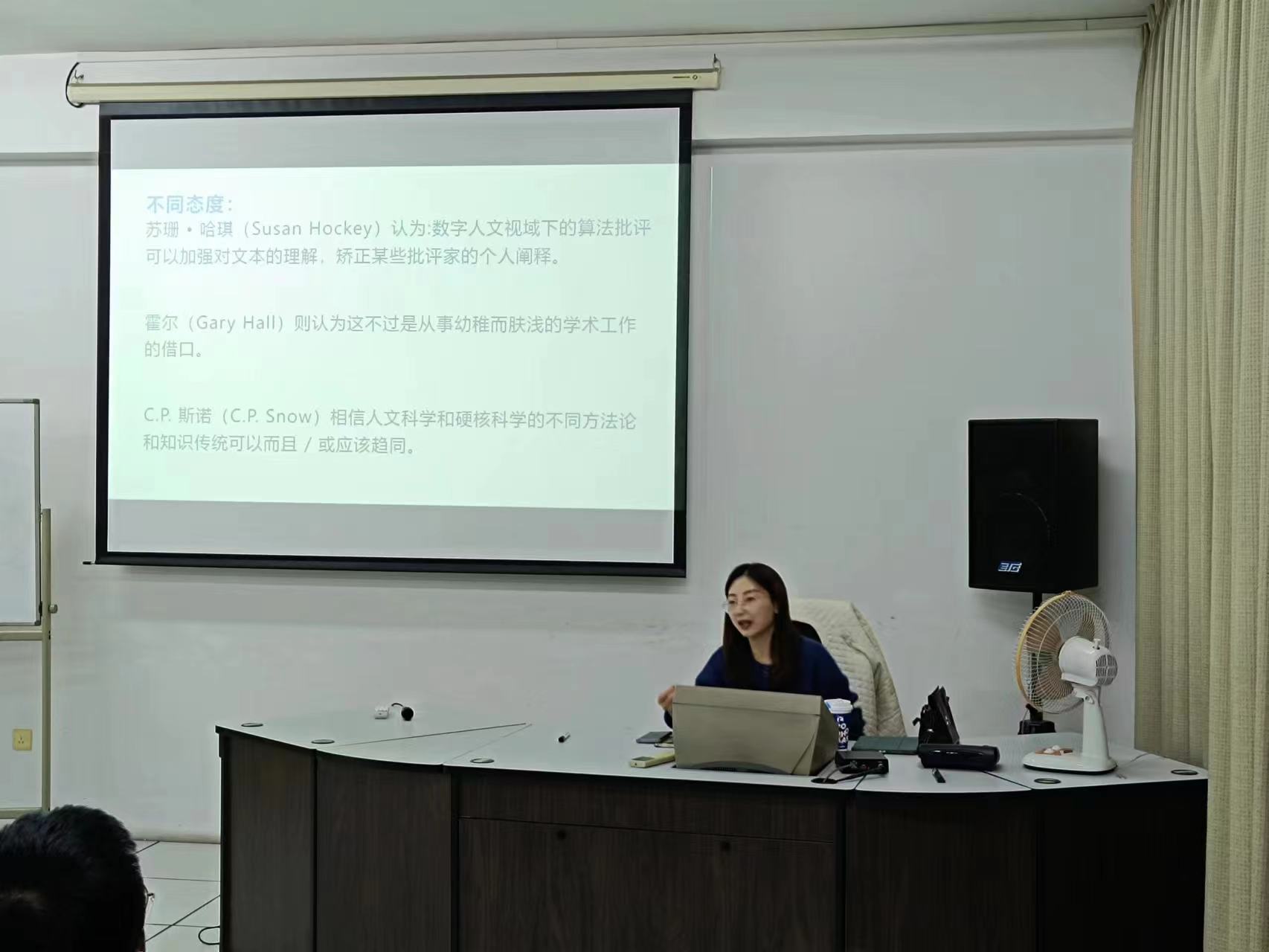 李阳老师进行了题为《算法批评视域下文学批评的分歧与融合》的报告。报告结合数字人文兴起的背景,指出以量化为核心的算法批评已经进入到文学批评领域之内。“定量”为主的算法批评与“定性”为主的传统批评方法的表象区别体现在批评媒介的数据化、批评实践的算法化、批评结果的可视化。隐性区别表现在“因果逻辑”典型和“大数定律”典型的区隔,以及围绕着语言“自明性”的历史性争论。李阳老师最后表示,二者的融合则是在主观的文学判断中融合实证意识,让数字技术贯穿人文价值,形成文学批评共同体的成长模式。