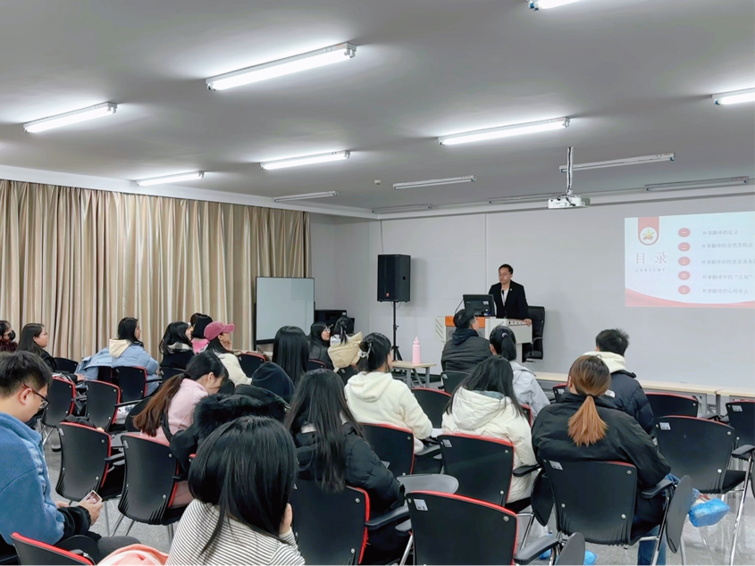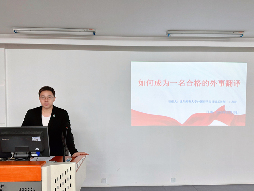 王惠波老师进行了题为《如何成为一名合格的外事翻译?》的报告。王老师首先介绍了外事与外交的不同。他指出外事翻译本质是应用(文体)翻译,具有灵活性、专业术语庞大性等特点。在进行外事翻译时要时刻秉承国家之间一律平等的原则。随后王老师以生动、诙谐的方式,就自己丰富的外事翻译经验与同学们能进行了分享。同时建议各位有志向成为口译的同学要紧跟国家动向,关注时事,持续拓展知识储备,不断提升翻译水平。